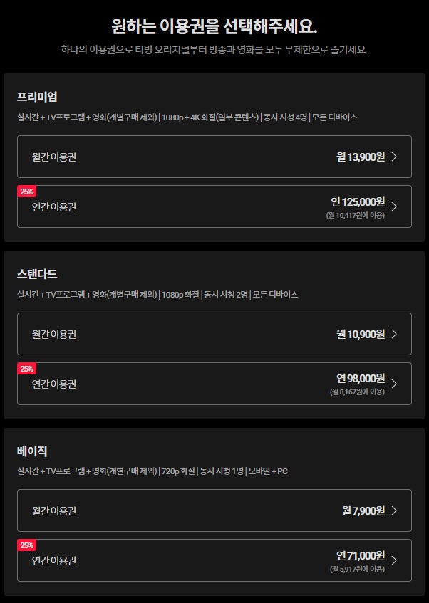티빙 요금제는 현재 크게 베이직, 스탠다드, 프리미엄 이렇게 3가지가 있다.